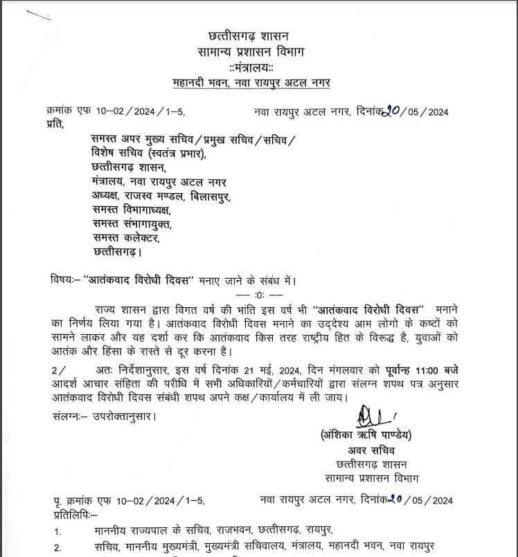 छत्तीसगढ़ में कल को मनाया जाएगा आंतकवाद विरोधी दिवस