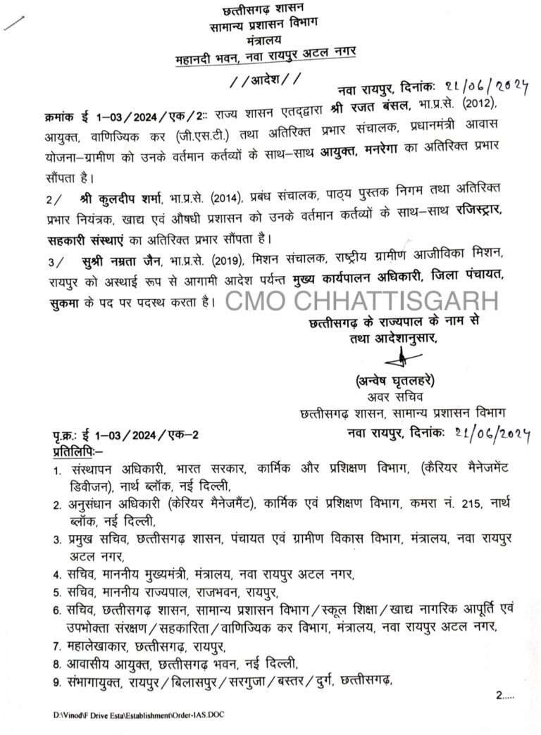 IAS रजत बंसल बनाए गए मनरेगा आयुक्त, कुलदीप शर्मा को मिली सहकारी संस्थाएं रजिस्ट्रार की अतिरिक्त जिम्मेदारी, नम्रता जैन बनीं सुकमा जिला पंचायत सीईओ