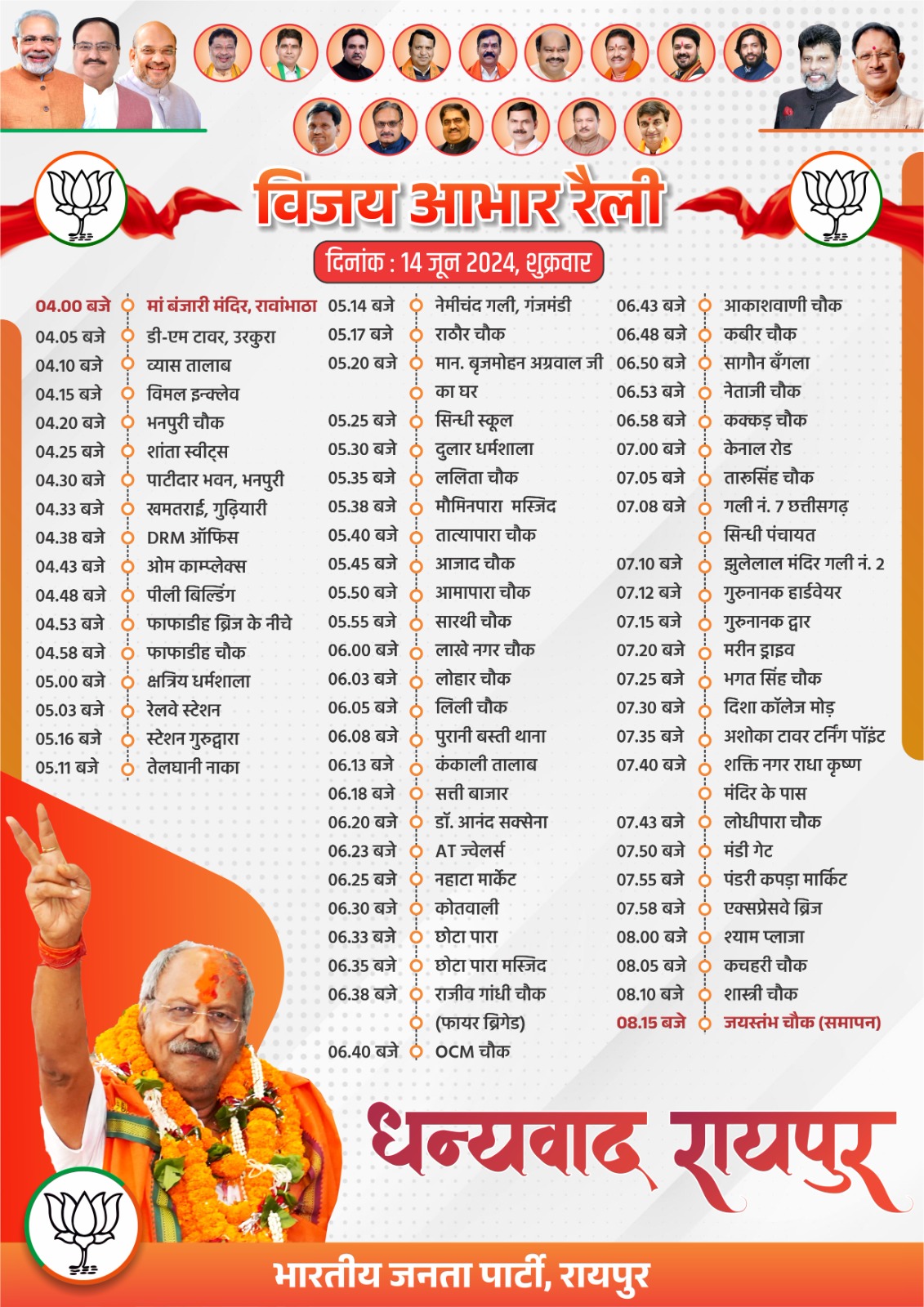 रायपुर- रायपुर लोकसभा से 575285 मतों से जीतकर देश के टॉप टेन विजेताओं में शामिल भाजपा सांसद बृजमोहन अग्रवाल कल 14 जून को रायपुर में विजय आभार रैली निकालेंगे। उनकी यह रैली मां बंजारी मंदिर रावाभाटा बिरगांव से संध्या 4:00 बजे प्रारंभ होगी। पश्चात 04.05 बजे डी-एम टावर, उरकुरा,04.10 बजे व्यास तालाब, 04.15 बजे विमल इन्क्लेव, 04.20 बजे भनपुरी चौक, 04.25 बजे शांता स्वीट्स, 04.30 बजे पाटीदार भवन, भनपुरी, 04.33 बजे खमतराई, गुढ़ियारी, 04.38 बजे DRM ऑफिस, 04.43 बजे ओम काम्प्लेक्स, 04.48 बजे पीली बिल्डिंग, 04.53 बजे फाफाडीह ब्रिज के नीचे, 04.58 बजे फाफाडीह चौक, 05.00 बजे क्षत्रिय धर्मशाला, 05.03 बजे रेलवे स्टेशन, 05.16 बजे स्टेशन गुरुद्वारा, 05.11 बजे तेलघानी नाका, 05.14 बजे नेमीचंद गली, गंजमंडी, 05.17 बजे राठौर चौक, 05.20 बजे मान. बृजमोहन अग्रवाल जी का घर, 05.25 बजे सिन्धी स्कूल,05.30 बजे दुलार धर्मशाला, 05.35 बजे ललिता चौक, 05.38 बजे मौमिनपारा मस्जिद, 05.40 बजे तातयापारा चौक, 05.45 बजे आजाद चौक, 05.50 बजे आमापारा चौक, 05.55 बजे सारथी चौक, 06.00 बजे लाखे नगर चौक, 06.03 बजे लोहार चौक, 06.05 बजे लिली चौक, 06.08 बजे पुरानी बस्ती थाना, 06.13 बजे कंकाली तालाब, 06.18 बजे सत्ती बाजार, 06.20 बजे डॉ. आनंद सक्सेना, 06.23 बजे AT ज्वेलर्स, 06.25 बजे नहाटा मार्केट, 06.30 बजे कोतवाली, 06.33 बजे छोटा पारा, 06.35 बजे छोटा पारा मस्जिद, 06.38 बजे राजीव गांधी चौक (फायर ब्रिगेड), 06.40 बजे OCM चौक, 06.43 बजे आकाशवाणी चौक, 06.48 बजे कबीर चौक, 06.50 बजे सागौन बँगला, 06.53 बजे नेताजी चौक, 06.58 बजे कक्कड़ चौक, 07.00 बजे केनाल रोड, 07.05 बजे तारुसिंह चौक, 07.08 बजे गली नं. 7 छत्तीसगढ़ सिन्धी पंचायत, 07.10 बजे झुलेलाल मंदिर गली नं. 2, 07.12 बजे गुरुनानक हार्डवेयर, 07.15 बजे गुरुनानक द्वार, 07.20 बजे मरीन ड्राइव, 07.25 बजे भगत सिंह चौक, 07.30 बजे दिशा कॉलेज मोड़, 07.35 बजे अशोका टावर टर्निंग पॉइंट, 07.40 बजे शक्ति नगर राधा कृष्ण, 07.43 बजे मंदिर के पास लोधीपारा चौक, 07.50 बजे मंडी गेट, 07.55 बजे पंडरी कपड़ा मार्किट, 07.58 बजे एक्सप्रेसवे ब्रिज, 08.00 बजे श्याम प्लाजा, 08.05 बजे कचहरी चौक, 08.10 बजे शास्त्री चौक, 08.15 बजे जयस्तंभ चौक पर रैली का समापन होगा।