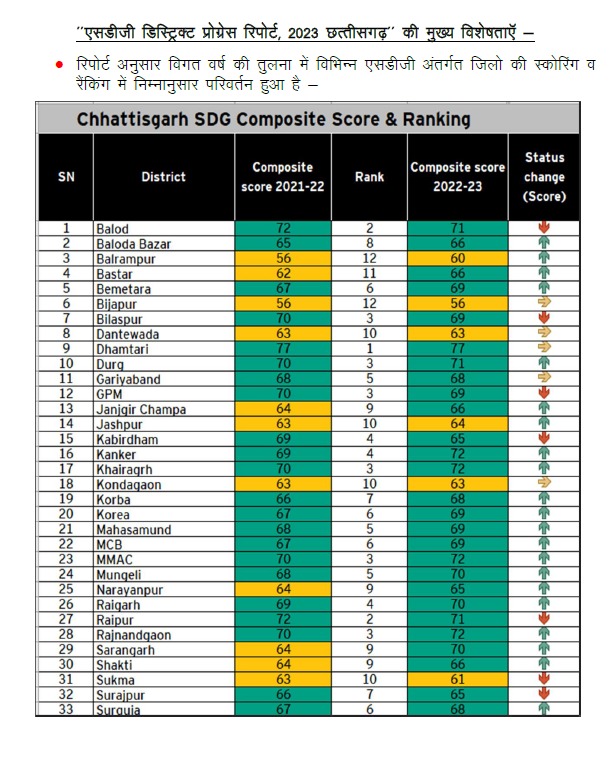 राज्य नीति आयोग के उपाध्यक्ष अजय सिंह द्वारा इस अवसर पर जानकारी दी गई कि राज्य नीति आयोग द्वारा तैयार किये गये ’’एसडीजी डिस्ट्रिक्ट प्रोग्रेस रिपोर्ट, 2023़’’ के 82 इंडिकेटर एवं ’’एसडीजी स्टेट प्रोग्रेस रिपोर्ट, 2023’’ के 275 इंडिकेटर में प्रगति के आधार पर विभाग एवं जिला कलेक्टर व विभाग विभिन्न सतत् विकास लक्ष्यों के प्रगति का मूल्यांकन, अनुश्रवण एवं अनुशीलन कर सकेंगे। रिपोर्ट में सामाजिक, आर्थिक, पर्यावरणीय एवं अन्य पहलुओं संबधी इंडिकेटर में प्राप्त प्रगति के आधार पर जिलों को ’स्कोर’ व ’रैंकिंग’ प्रदाय की गई है।