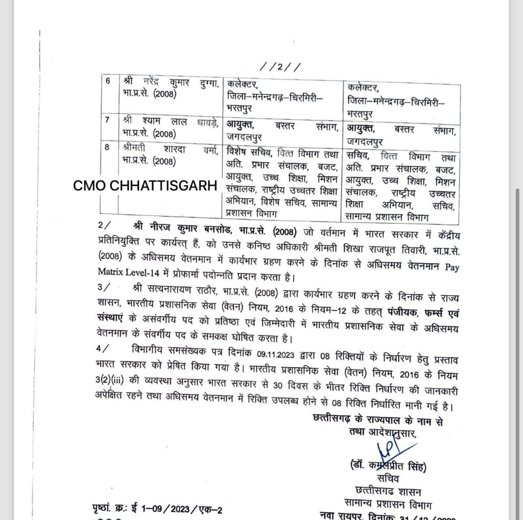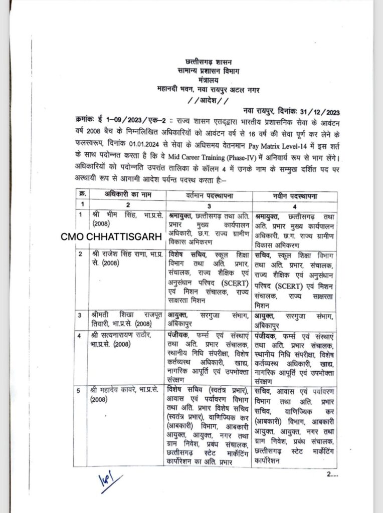 रायपुर- नये साल के ठीक पहले राज्य सरकार ने IAS अफसरों के प्रमोशन आदेश जारी किये हैं। 1994 बैच के IAS मनोज पिंगुआ के साथ-साथ सेंट्रल डिपुटेशन पर चल रहे तीन आईेएएस को प्रोफार्मा पदोन्नति दी गयी है। वहीं 2008 बैच के चार IAS अफसरों को सचिव प्रमोट किया गया है। जिन अफसरों को पदोन्नत किया गया है, उनमें शिक्षा विभाग के विशेष सचिव राजेश राणा, श्रमायुक्त भीम सिंह, सरगुजा कमिश्नर शिखा राजपूत और पंजीयक सत्यनारायण राठौर और विशेष सचिव महादेव कांवरे, कलेक्टर एमसीबी नरेंद्र दुग्गा, कमिश्नर श्याम धावड़े और विशेष सचिव शारदा वर्मा हैं।