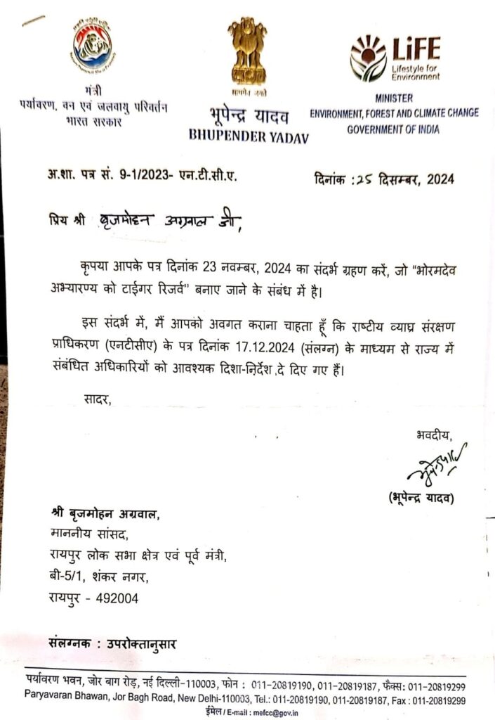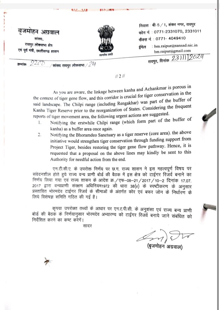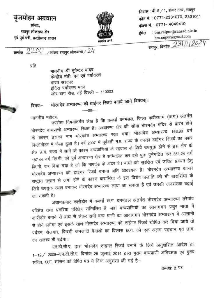 सांसद बृजमोहन अग्रवाल ने केंद्रीय वन मंत्री को लिखे पत्र में कहा था कि भोरमदेव अभ्यारण्य, जो कान्हा टाइगर रिजर्व के बफर क्षेत्र से जुड़ा हुआ है, वन्यजीव संरक्षण की दृष्टि से अत्यंत महत्वपूर्ण है। NTCA ने 28 जुलाई 2014 को इस क्षेत्र को टाइगर रिजर्व बनाने की अनुशंसा की थी। इसके बाद छत्तीसगढ़ राज्य वन्यजीव बोर्ड ने भी इसकी मंजूरी दी थी।