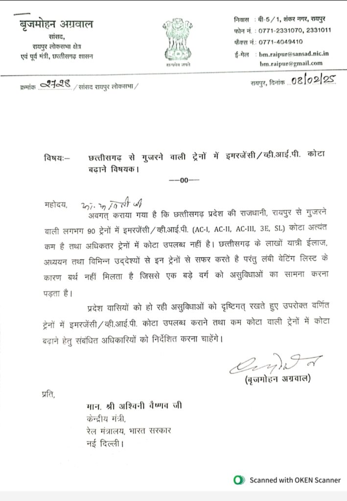रायपुर। छत्तीसगढ़ के लाखों यात्रियों की सुविधा को ध्यान में रखते हुए रायपुर सांसद बृजमोहन अग्रवाल ने केंद्रीय रेल मंत्री को पत्र लिखकर प्रदेश से गुजरने वाली ट्रेनों में स्लीपर समेत सभी श्रेणी में इमरजेंसी/व्ही.आई.पी. कोटा बढ़ाने की मांग की है। साथ ही, उन्होंने डीआरएम रायपुर और डीआरएम बिलासपुर से भी आवश्यक कदम उठाने को कहा है।