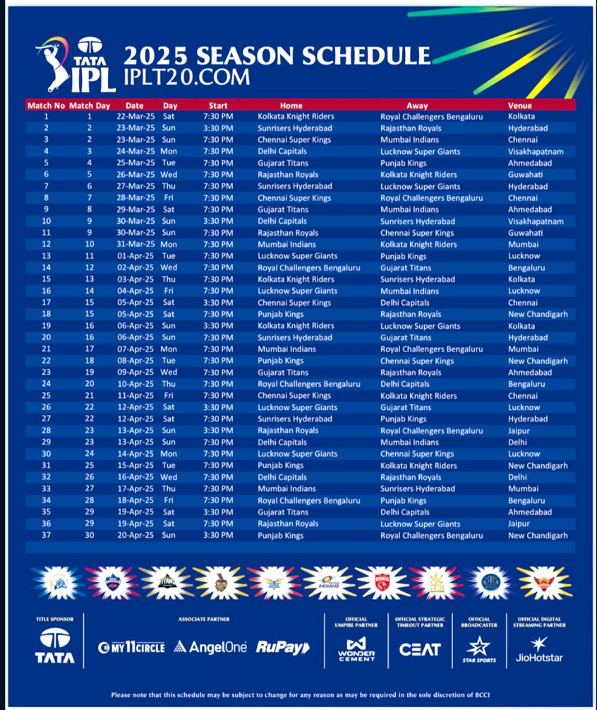 स्पोर्ट्स डेस्क। इंडियन प्रीमियर लीग का इंतज़ार कर रहे क्रिकेट फैंस के लिए बड़ी खुशखबरी सामने आई है। रविवार की शाम आईपीएल के 18वें सीजन के शेड्यूल का ऐलान कर दिया गया है। इस बार 22 मार्च से टूर्नामेंट की शुरुआत होगी। लीग का पहला मैच ईडन गार्डन में डिफेंडिंग चैंपियन कोलकाता नाइट राइडर्स (KKR) और रॉयल चैलेंजर्स बेंगलुरु (RCB) के बीच खेला जाएगा। आईपीएल के प्लेऑफ 20 से 25 मार्च के बीच हैदराबाद और कोलकाता में होंगे।