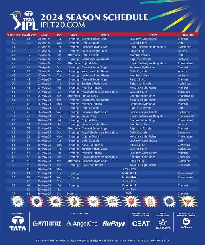 बता दें कि लीग का क्वालिफायर 1 और एलिमिनेटर हैदराबाद में और क्वालिफायर 2 कोलकाता में खेला जाएगा। फाइनल मैच 25 मई को कोलकाता में होगा। पुरे सीजन के दौरान 13 स्थानों पर 65 दिनों में कुल 74 मैच खेले जाएंगे।
