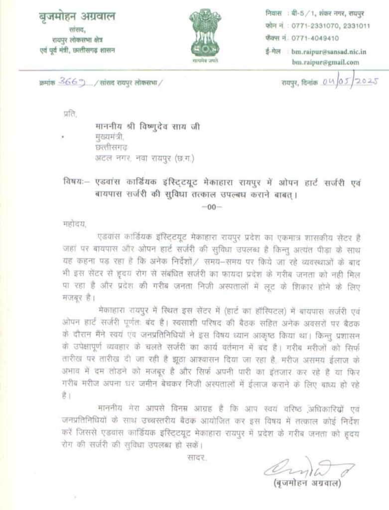 रायपुर। छत्तीसगढ़ के एकमात्र शासकीय हृदय रोग संस्थान एडवांस कार्डियक इंस्टिट्यूट, मेकाहारा रायपुर में बायपास और ओपन हार्ट सर्जरी की सेवाएं लंबे समय से बंद हैं। इस गंभीर स्थिति को देखते हुए रायपुर सांसद बृजमोहन अग्रवाल ने मुख्यमंत्री विष्णुदेव साय और स्वास्थ्य मंत्री श्याम बिहारी जायसवाल को पत्र लिखकर इन सेवाओं को तत्काल बहाल करने की मांग की है।