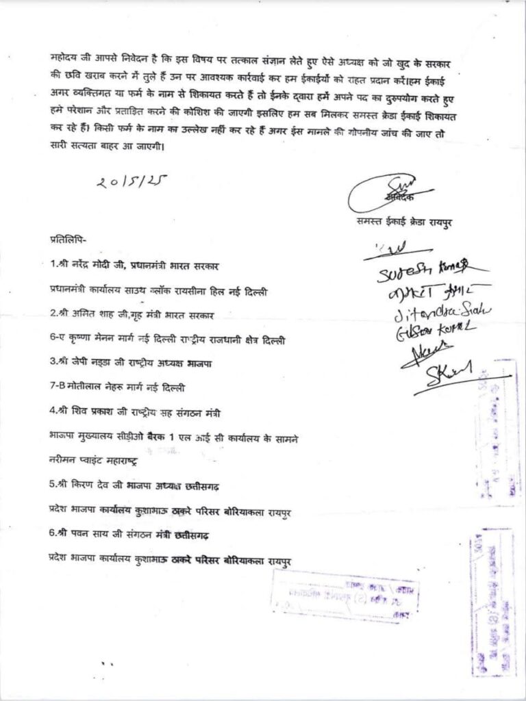 उन्होंने कहा कि जहा एक तरफ छत्तीसगढ़ में विष्णु के सुशासन में बेहतर कार्य हो रहा है तो वहीं दुसरे तरफ़ सुशासन पर ग्रहण लगाते हुए आपके ही सरकार के अंग क्रेडा के नवनियुक्त अध्यक्ष भुपेंद्र सवन्नी के द्वारा विगत कुछ दिनों से ईकाईयों को परेशान कर जितने का कार्य पुर्व में उनके पदभार ग्रहण के पहले आबंटित हुआ है और जो कार्य पूर्ण हो चुके हैं उसका 3% की मांग क्रेडा कार्यालय में पदस्थ अपने निज सहायक वैभव दुबे के माध्यम से अपने लिए की जा रही है। और नहीं देने पर किसी भी कारण का उल्लेख कर या कार्यों की जांच कराकर नोटिस दिलवाने और ब्लैक लिस्टेड करने की धमकी दी जा रही है।ऐसा करके लगातार हमें प्रताड़ित किया जा रहा है जिससे हम सब बहुत परेशान हैं।