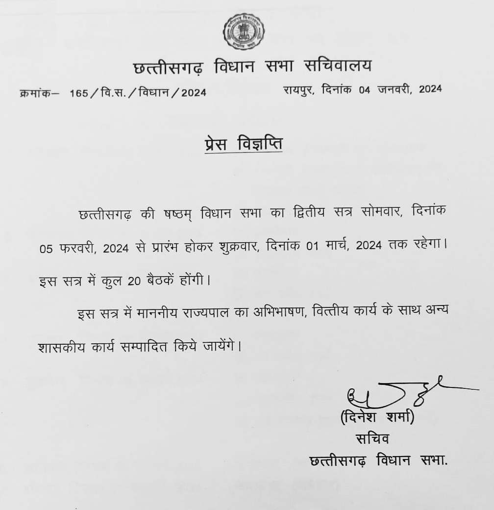 रायपुर। छत्तीसगढ़ की षष्ठम् विधान सभा का द्वितीय सत्र 5 फरवरी से शुरू होगा. 1 मार्च तक चलने वाले सत्र में कुल 20 बैठकें होंगी. सत्र के दौरान राज्यपाल के अभिभाषण के अलावा वित्तीय कार्य के साथ अन्य शासकीय कार्य सम्पादित किए जाएंगे