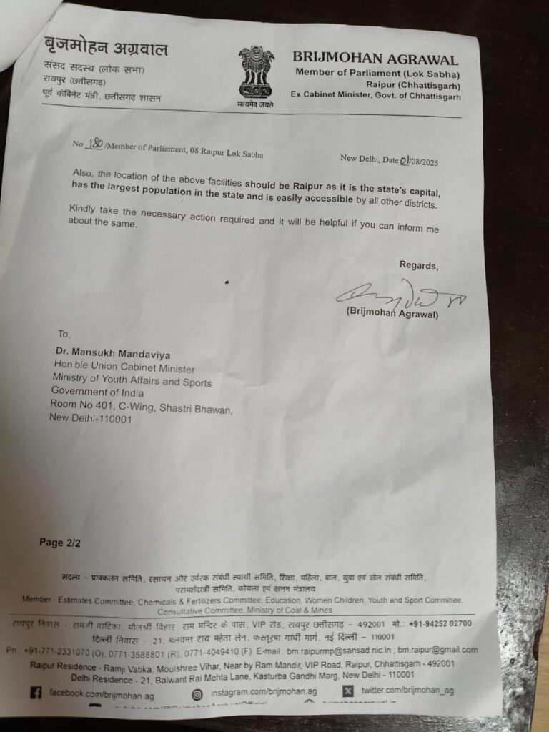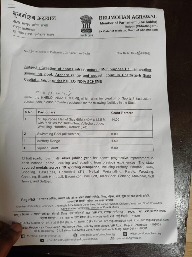 सांसद बृजमोहन अग्रवाल ने कहा कि “खेलो इंडिया योजना” के तहत यदि इन सुविधाओं की स्थापना होती है, तो इससे छत्तीसगढ़ के खिलाड़ियों को विश्वस्तरीय प्रशिक्षण, बेहतर संसाधन और अंतरराष्ट्रीय मंच पर राज्य और देश का नाम रोशन करने का अवसर मिलेगा।