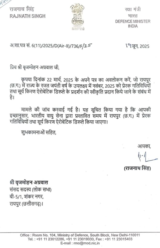 इस भव्य आयोजन के लिए बृजमोहन अग्रवाल ने रक्षा मंत्री राजनाथ सिंह से भेंट कर आग्रह किया था कि छत्तीसगढ़ के स्थापना दिवस पर सूर्यकिरण एरोबेटिक शो का आयोजन रायपुर में किया जाए। रक्षा मंत्री ने न केवल उनकी भावना का सम्मान किया बल्कि स्वयं पत्र लिखकर इसकी औपचारिक अनुमति भी प्रदान की।