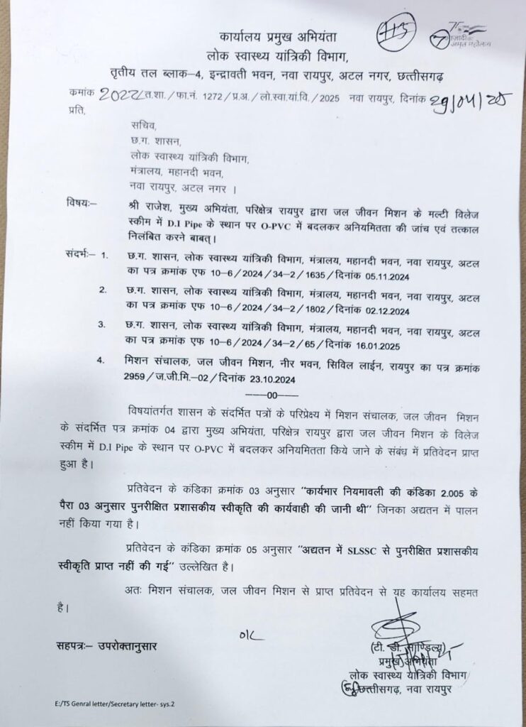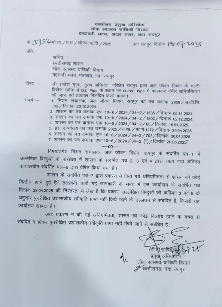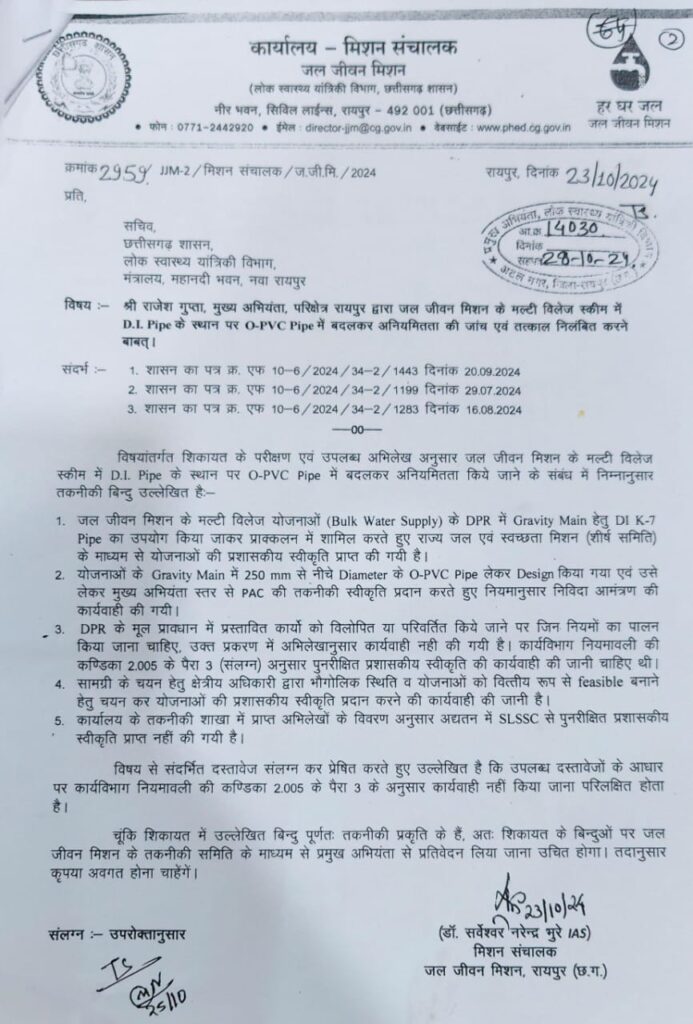 रायपुर। जल जीवन मिशन की मल्टी विलेज स्कीम में कथित तकनीकी अनियमितताओं को लेकर छत्तीसगढ़ शासन के लोक स्वास्थ्य यांत्रिकी विभाग में बड़ा विवाद खड़ा हो गया है। पूर्व संचालक डॉ. सर्वेश्वर नरेंद्र भूरे ने 23 अक्टूबर 2024 को पीएचई विभाग के सचिव मोहम्मद कैसर अब्दुल हक को एक विस्तृत शिकायत-पत्र भेजकर मुख्य अभियंता, परिक्षेत्र रायपुर राजेश गुप्ता के खिलाफ D.I. Pipe की जगह O-PVC Pipe उपयोग करने जैसे गंभीर आरोप लगाते हुए अनियमितता की जांच करने तथा राजेश गुप्ता के खिलाफ तत्काल निलंबन की कार्रवाई करने की बात लिखी गई थी।
