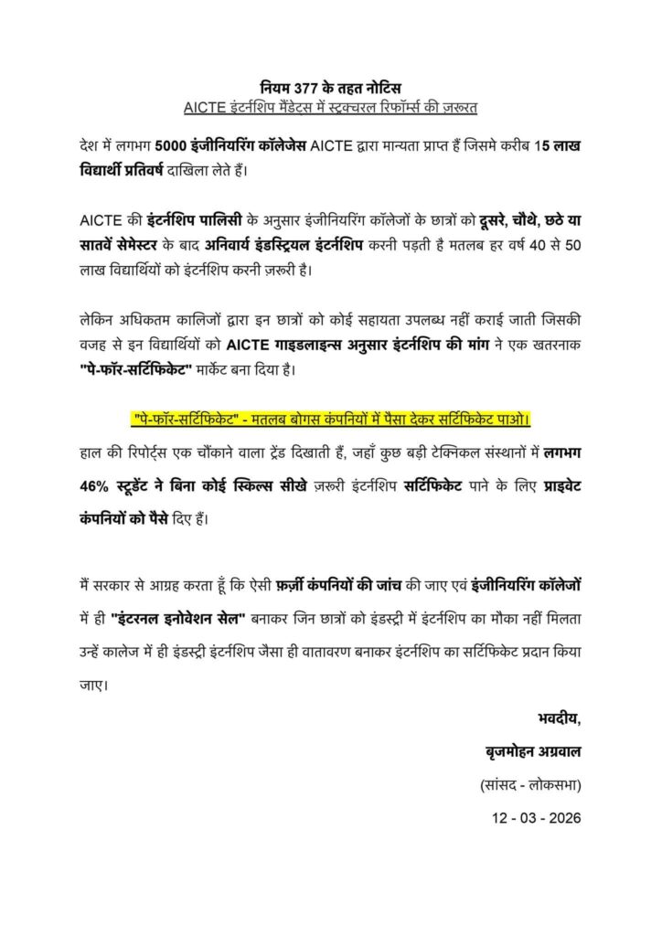नई दिल्ली/रायपुर। रायपुर सांसद एवं वरिष्ठ भाजपा नेता बृजमोहन अग्रवाल ने देश की तकनीकी शिक्षा व्यवस्था में व्याप्त एक गंभीर विसंगति को संसद के पटल पर रखते हुए केंद्र सरकार से क्रांतिकारी सुधारों की मांग की है। ‘नियम 377’ के तहत सदन का ध्यान आकर्षित करते हुए उन्होंने एआईसीटीई (AICTE) की इंटर्नशिप पॉलिसी में स्ट्रक्चरल रिफॉर्म्स की ज़रूरत पर बल दिया और “पे-फॉर-सर्टिफिकेट” के फलते-फूलते फर्जी मार्केट को तत्काल समाप्त करने का आह्वान किया है।