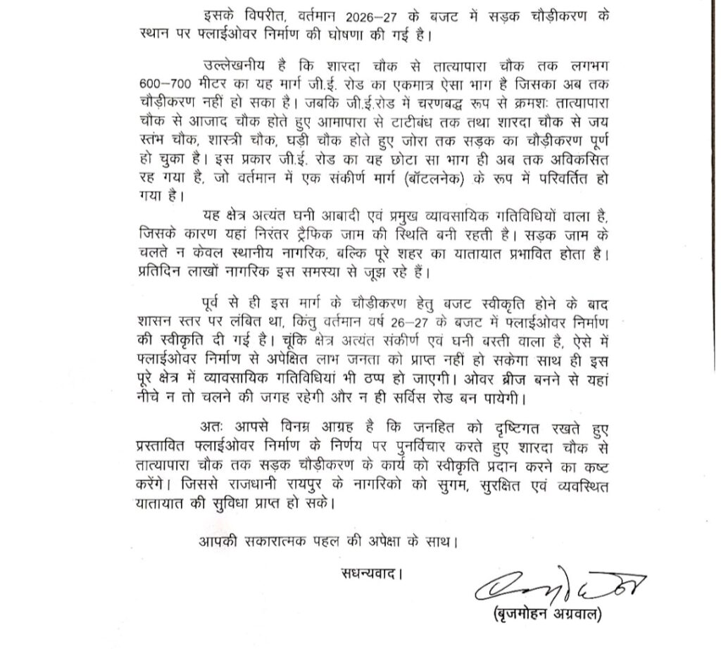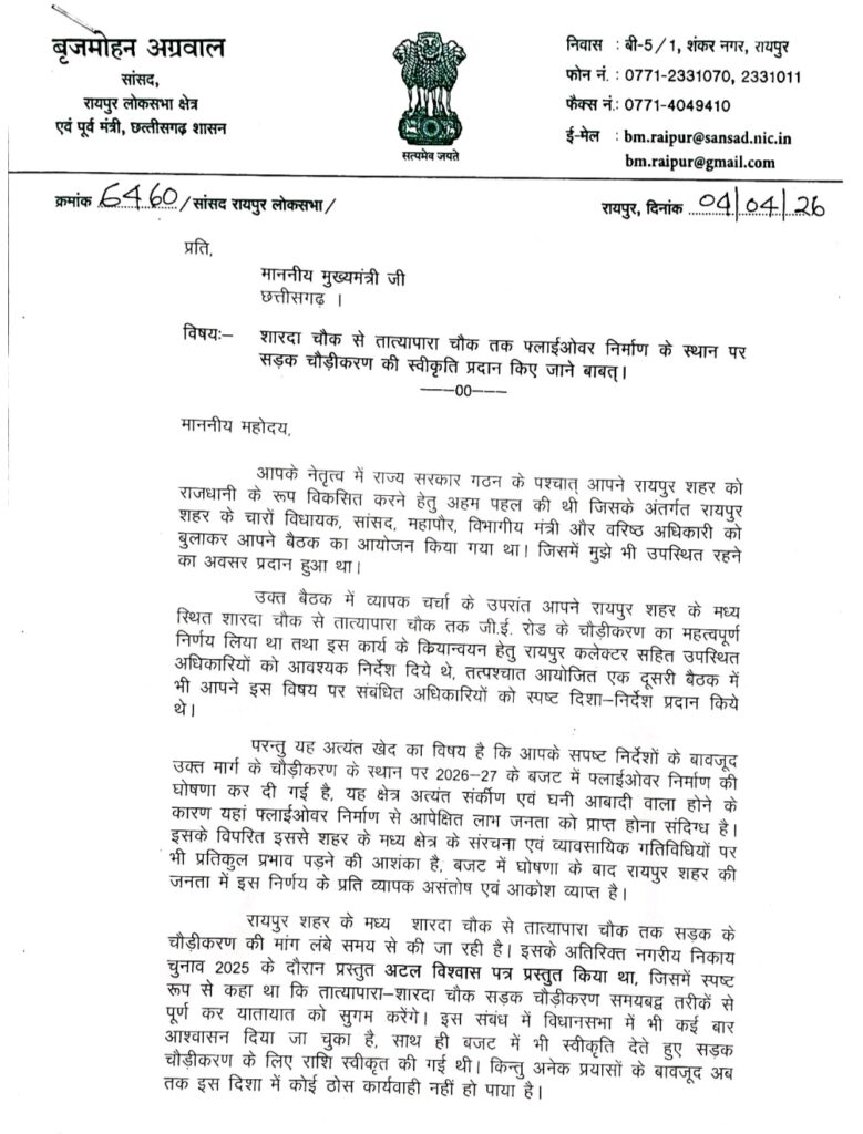 सांसद बृजमोहन अग्रवाल ने मुख्यमंत्री से विनम्र आग्रह किया है कि जनहित को सर्वोपरि रखते हुए फ्लाईओवर निर्माण के निर्णय पर पुनर्विचार कर शारदा चौक से तात्यापारा चौक तक सड़क चौड़ीकरण के कार्य को प्राथमिकता दी जाए, ताकि राजधानीवासियों को सुगम, सुरक्षित और व्यवस्थित यातायात की सुविधा मिल सके।