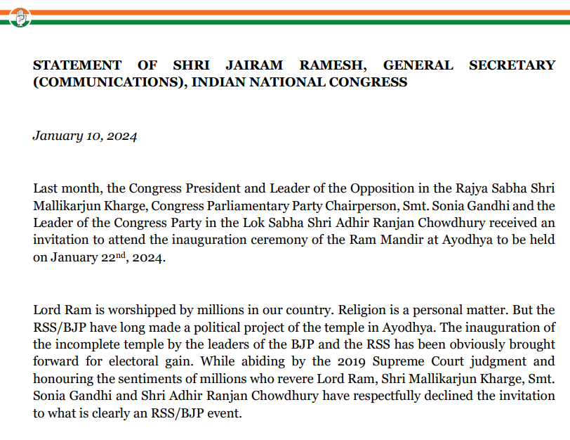 कांग्रेस के महासचिव जयराम रमेश की ओर से जारी बयान में कहा गया कि पिछले महीने कांग्रेस अध्यक्ष और राज्यसभा में विपक्ष के नेता मल्लिकार्जुन खड़गे, कांग्रेस संसदीय दल की अध्यक्ष सोनिया गांधी और लोकसभा में कांग्रेस पार्टी के नेता अधीर रंजन चौधरी को 22 जनवरी, 2024 को अयोध्या में होने वाले राम मंदिर के उद्घाटन समारोह में शामिल होने का निमंत्रण मिला.