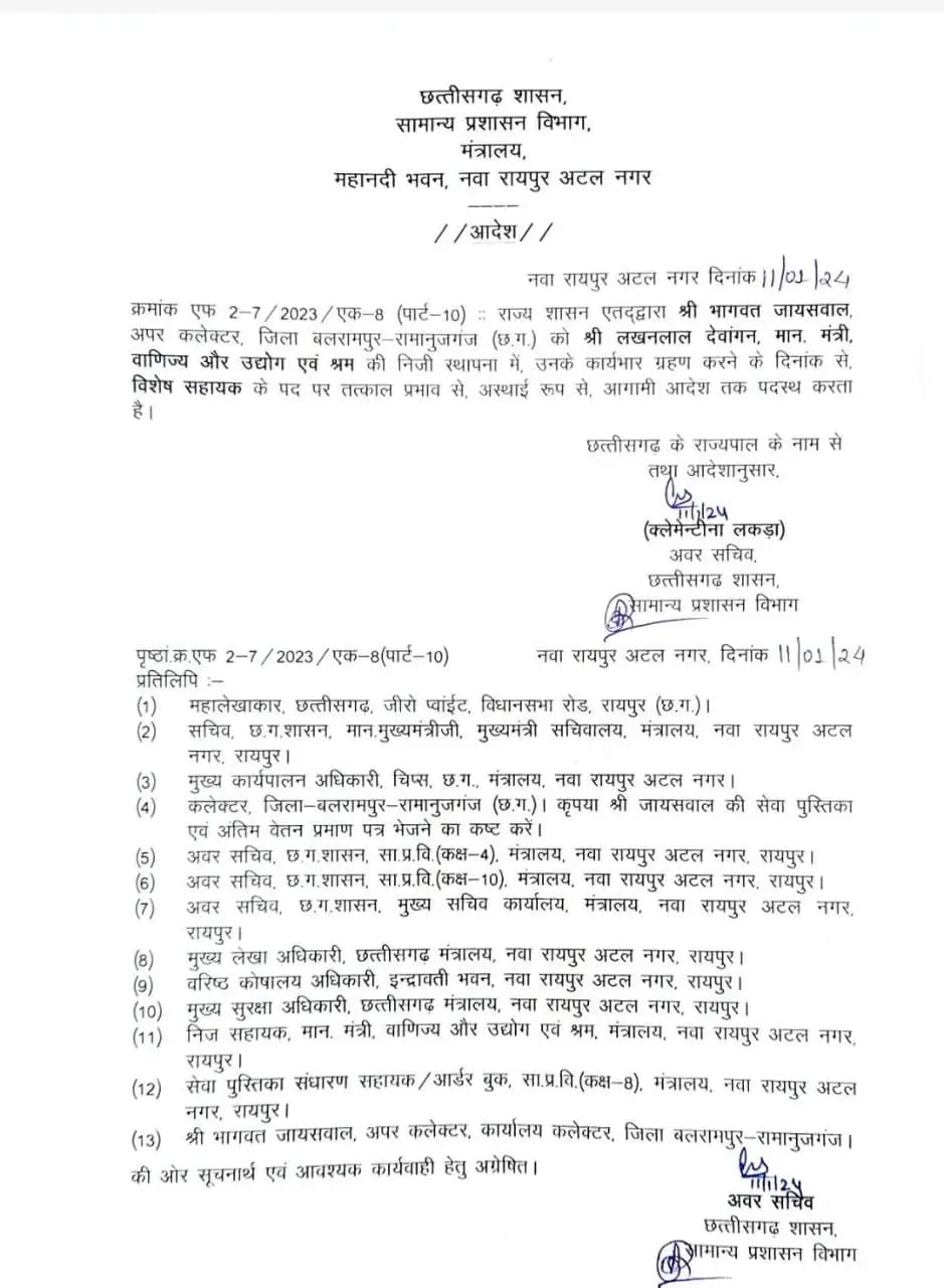 अपर कलेक्टर भागवत जायसवाल बने मंत्री लखनलाल देवांगन के विशेष सहायक