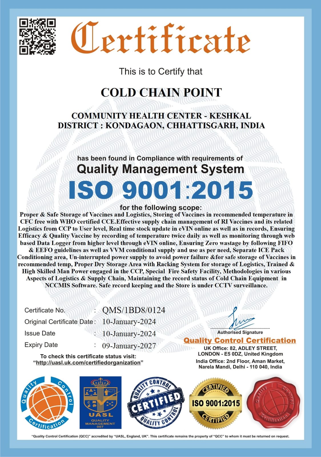 कांकेर, कोंडागांव और नारायणुपर जिले के इन शासकीय अस्पतालों के कोल्ड चैन पॉइंट्स में अंतर्राष्ट्रीय मानकीकरण संगठन (ISO) द्वारा वैक्सीन एवं लॉजिस्टिक के उचित, सुरक्षित एवं अनुशंसित तापमान में वैक्सीन के भंडारण आदि की समीक्षा के बाद आईएसओ सर्टिफिकेट जारी किया गया है। स्वास्थ्य विभाग के अधिकारियों ने बताया कि यूएनडीपी के तकनीकी सहयोग से सामुदायिक स्वास्थ्य केन्द्र नरहरपुर और केशकाल एवं प्राथमिक स्वास्थ्य केंद्र बेनूर में वैक्सीन के रख-रखाव, भण्डारण आदि की व्यवस्था की जा रही थी। आईएसओ टीम द्वारा इन अस्पतालों में वैक्सीन और उससे संबंधित लॉजिस्टिक का प्रभावी आपूर्ति श्रृंखला प्रबंधन और वास्तविक समय में स्टॉक अपडेट ऑनलाइन के साथ-साथ रिकॉर्ड की भी की जांच की गई।