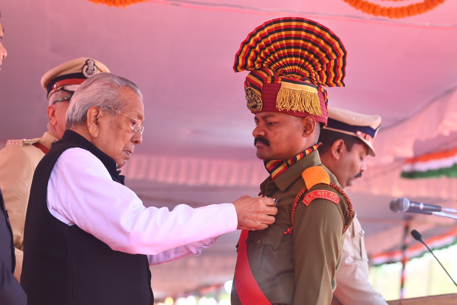 रायपुर। राजधानी रायपुर के पुलिस परेड ग्राउंड में गणतंत्र दिवस के राज्य स्तरीय मुख्य समारोह में राज्यपाल विश्वभूषण हरिचंदन ने उत्कृष्ट कार्य करने वाले पुलिस विभाग के अधिकारियों-कर्मचारियों को सम्मानित किया। उन्होंने पुलिस वीरता पदक, विशिष्ट सेवा हेतु राष्ट्रपति का पुलिस पदक, सराहनीय सेवा हेतु भारतीय पुलिस पदक तथा गृह रक्षक एवं नागरिक सुरक्षा सेवा पदक से सम्मानित किया।