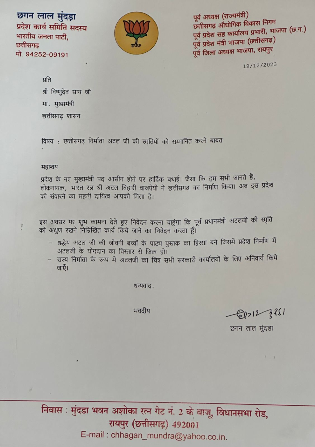 रायपुर- छत्तीसगढ़ औद्योगिक विकास निगम के पूर्व अध्यक्ष छगन लाल मुंदड़ा ने मुख्यमंत्री विष्णुदेव साय जी से मुलाकात कर उन्हें पत्र सौंपा है. जिसमें उन्होंने पूर्व प्रधानमंत्री भारत रत्न छत्तीसगढ़ के निर्माता स्व: अटल बिहारी वाजपेयी की जीवनी को पाठ्य पुस्तक का हिस्सा बनाए जाने की मांग की है.