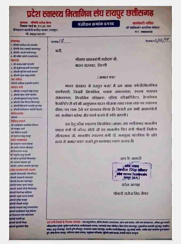 “प्रदेश स्वास्थ्य मितानिन संघ”ने “देश के मुखिया” को पत्र लिखकर इस निर्णय के लिए , प्रधानमंत्री मोदी का आभार व्यक्त किया है।