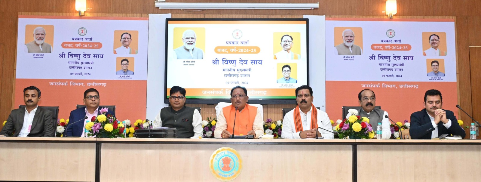 मुख्यमंत्री श्री साय आज वित्त मंत्री ओ.पी. चौधरी द्वारा विधानसभा में वित्तीय वर्ष 2024-25 का बजट प्रस्तुत करने के बाद समिति कक्ष में मीडिया प्रतिनिधियों को सम्बोधित कर रहे थे। इस अवसर पर उप मुख्यमंत्री अरूण साव और विजय शर्मा, वित्त मंत्री ओ.पी. चौधरी, मुख्य सचिव अमिताभ जैन, मुख्यमंत्री के सचिव पी. दयानंद और वित्त सचिव अंकित आनंद भी उपस्थित थे।
