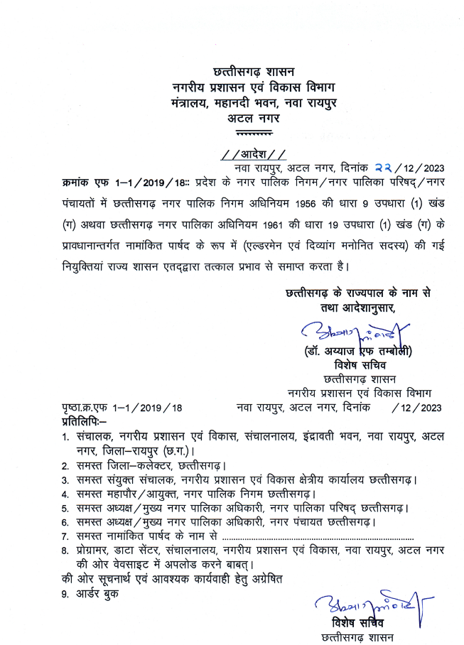 रायपुर- नगरीय निकायों के 12 सौ से अधिक एल्डरमैन (मनोनीत पार्षद) की सेवाएं तत्काल प्रभाव से खत्म कर दिया गया है। इस आशय के आदेश जारी कर दिए गए हैं। बताया गया कि नगर पालिका निगम, नगर पालिका और नगर पंचायतों में कांग्रेस सरकार ने पार्टी के नेताओं को एल्डरमैन नियुक्त किया था। करीब दो साल पहले ये नियुक्तियां हुई थी। अब इन नियुक्तियों को खत्म कर दिया गया है।