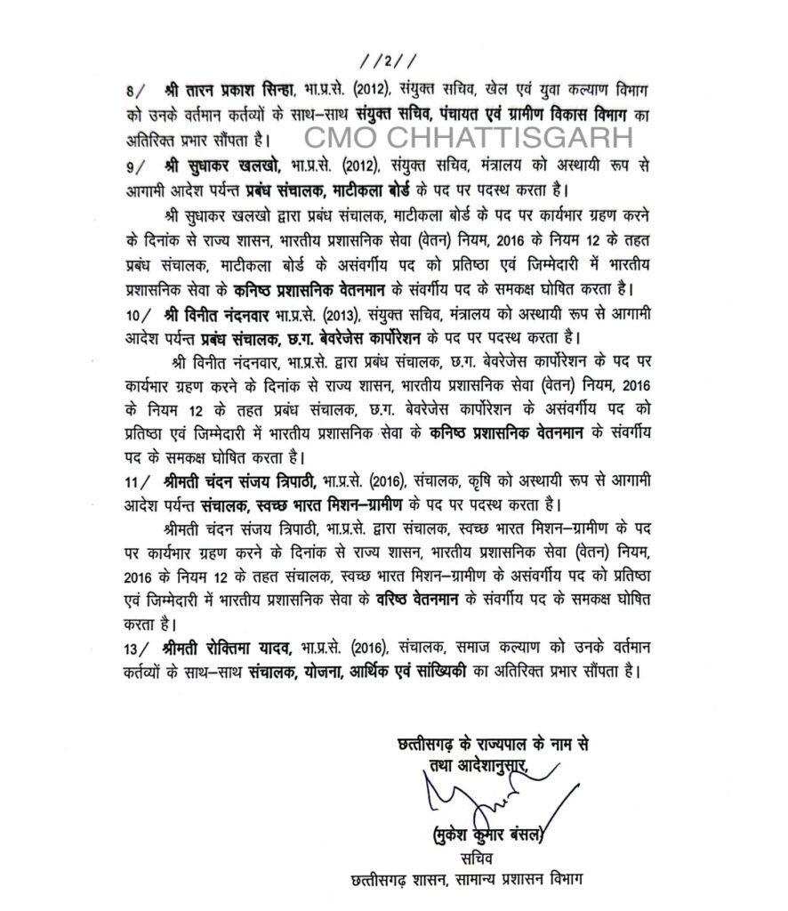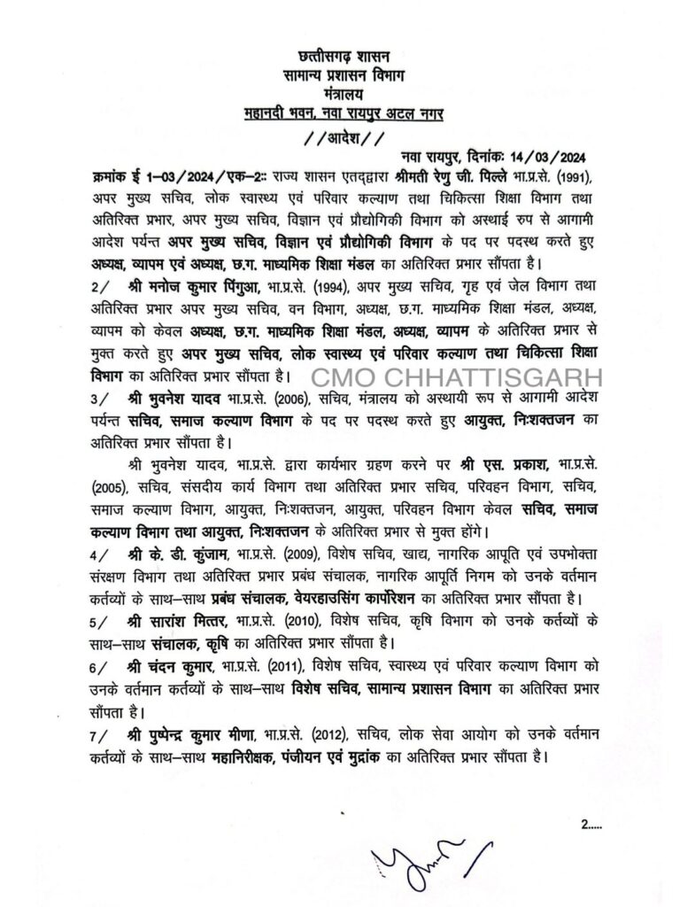 रायपुर। प्रदेश में लगातार ट्रांसफर का दौर जारी है. इस बीच सुबह-सुबह राज्य सरकार ने भारतीय प्रशासनिक सेवा (IAS) के अधिकारियों का तबादला किया है. इस संबंध में सामान्य प्रशासन विभाग ने आदेश जारी किया है. जारी आदेश के अनुसार 13 आईएएस अफसरों के प्रभार में बदलाव किया गया है साथ अतिरिक्त प्रभार सौंपा गया है.