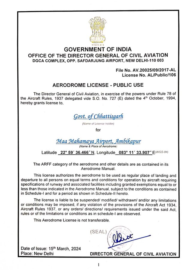 सिंहदेव ने ट्वीट कर कहा, अपार हर्ष के साथ सभी को सूचित करना चाहूंगा कि मां महामाया एयरपोर्ट अंबिकापुर को आज लाइसेंस प्राप्त हो गया है. हम सभी के लंबे संघर्ष, कई मीटिंग, निरीक्षण, लगातार कोशिशों के बाद अंततः तत्कालीन कांग्रेस सरकार के प्रयासों ने एक सुंदर स्वरूप प्राप्त किया है, जो छत्तीसगढ़ के लिए एक अद्भुत उपलब्धि है. सरगुजा संभाग के सभी निवासियों को इसके लिए अशेष बधाई. उन सभी लोगों का हार्दिक आभार, जिन्होंने इस मुहिम के लिए अथक मेहनत की.
