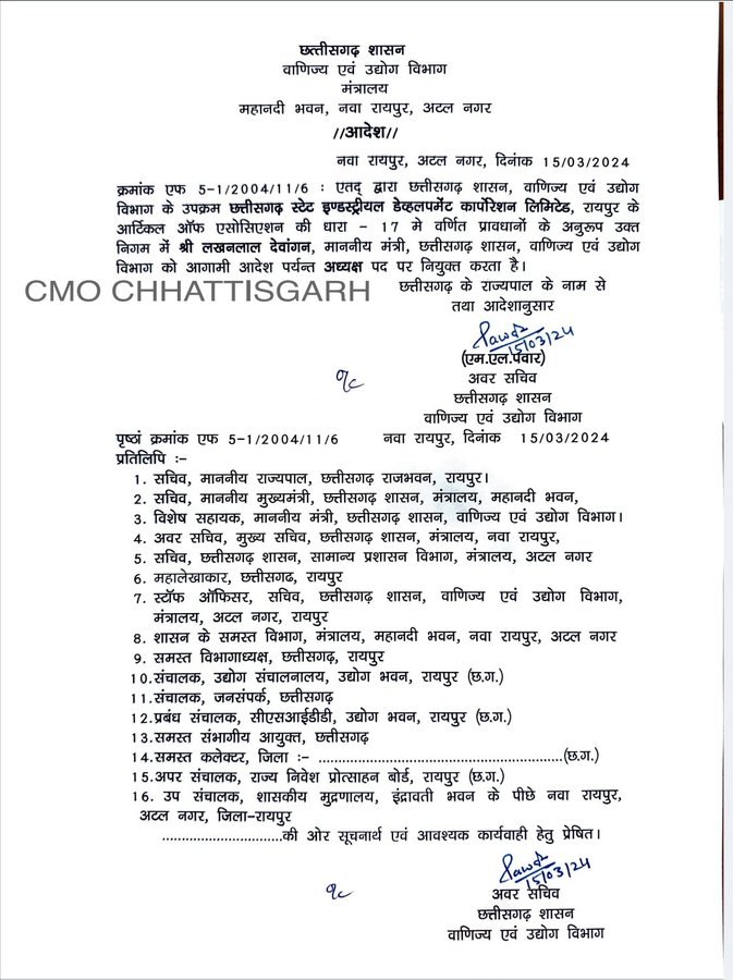 रायपुर- राज्य शासन ने वाणिज्य एवं उद्योग मंत्री लखनलाल देवांगन को छत्तीसगढ़ स्टेट इंडस्ट्रियल डेवलपमेंट कार्पोरशन लिमिटेड (CSIDC) रायपुर के अध्यक्ष नियुक्त किया है. वाणिज्य एवं उद्योग विभाग के अवर सचिव एम एल पवार ने इस संबंध में आदेश जारी कर दिया है.