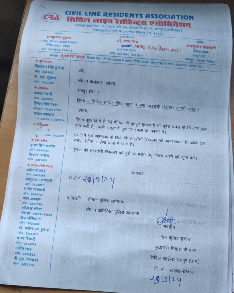दरअसल, कांग्रेस नेता रामकुमार शुक्ला ने अपनी लाइसेंसी रिवॉल्वर को वापस करने की मांग करते हुए एक पत्र कलेक्टर को लिखा है. उन्होंने लिखा है कि कि पूर्व मुख्यमंत्री भूपेश बघेल के खिलाफ मैंने कुछ बातें कही है. भूपेश बघेल के खिलाफ बोलने से मुझ पर हमला हो सकता है. मेरा लाइसेंसी रिवाल्वर आत्मरक्षा के लिए दिया जाए. चुनाव के कारण मेरा रिवाल्वर इस समय थाने में जमा है.
