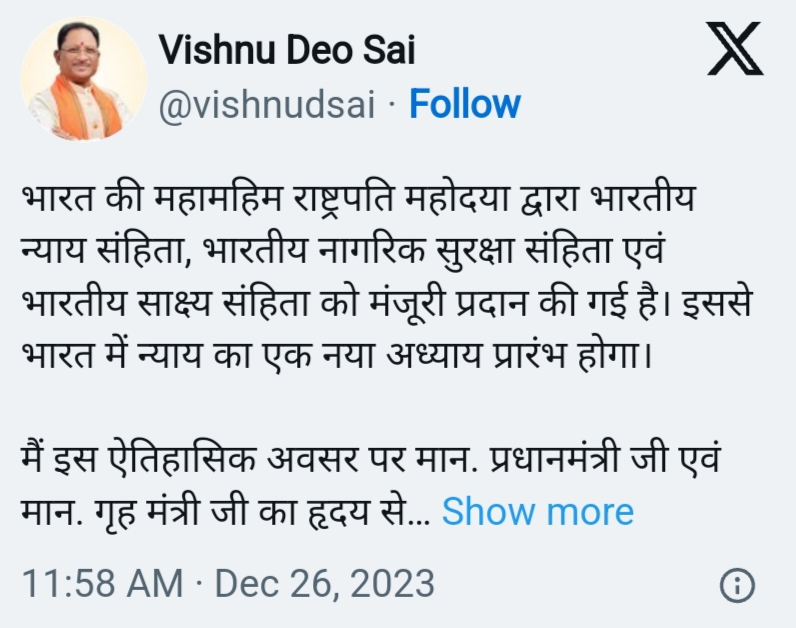 कानून बने भारतीय न्याय संहिता 2023 के 3 बिल, राष्ट्रपति द्रौपदी मुर्मू ने दी मंजूरी, सीएम साय ने कहा- भारत में न्याय का एक नया अध्याय प्रारंभ होगा